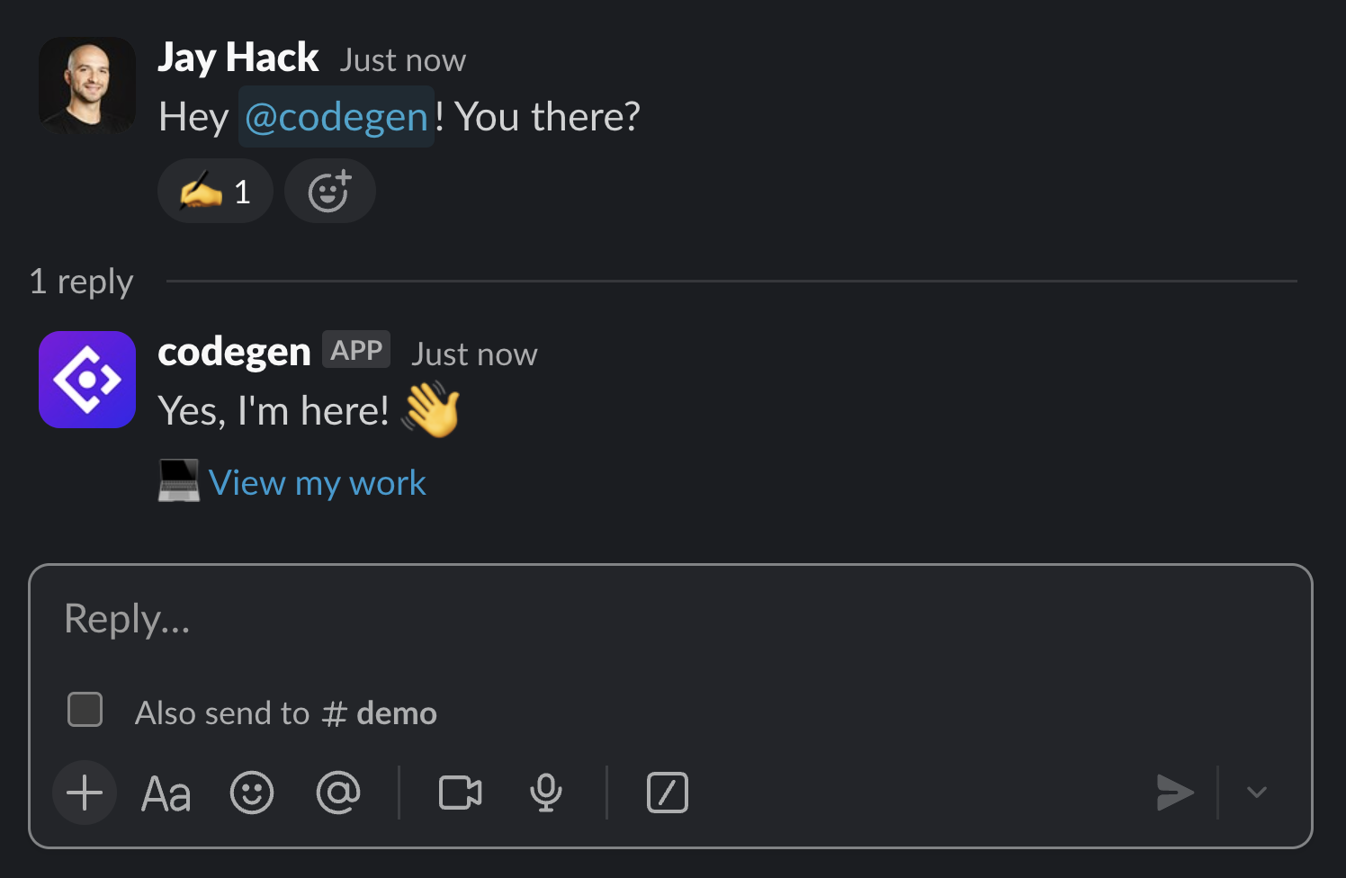 @codegenin threads to continue the conversation. - Direct messages: Send a DM to the Codegen bot for private conversations.