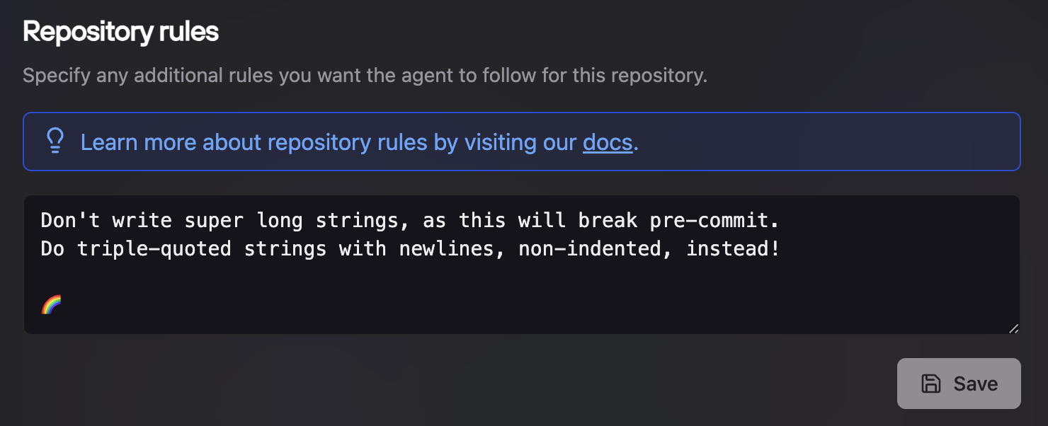 When an agent is assigned a task on a repository with defined rules, those rules are automatically prepended or made available to the LLM as part of its context. This means the agent “sees” these rules alongside the actual task or prompt it receives. For example, if you have a rule like “Always use tabs for indentation,” the agent will be reminded of this preference before it starts writing or modifying code in that repository.Accessing and Configuring Repository Rules